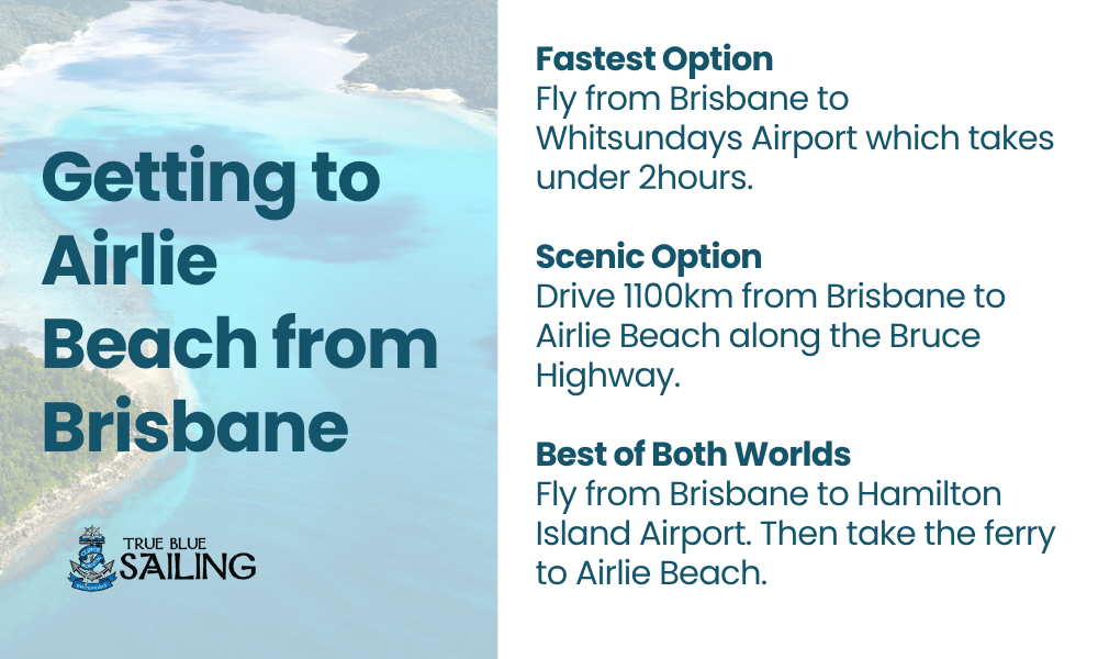 Once you land at Hamilton Island Airport (HTI), you can take a ferry to Airlie Beach or you can even start your reef tour and end at Airlie Beach (depending on your cruise and provider). Flying from Brisbane to Hamilton Island Airport (HTI) is one of the best ways to incorporate a marine leg into your travel plans and provides an ideal mix of scenery and practicality for those looking to explore and see the region without making the journey the centrepiece of the holiday.